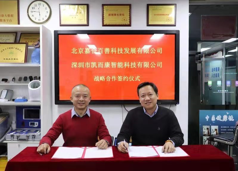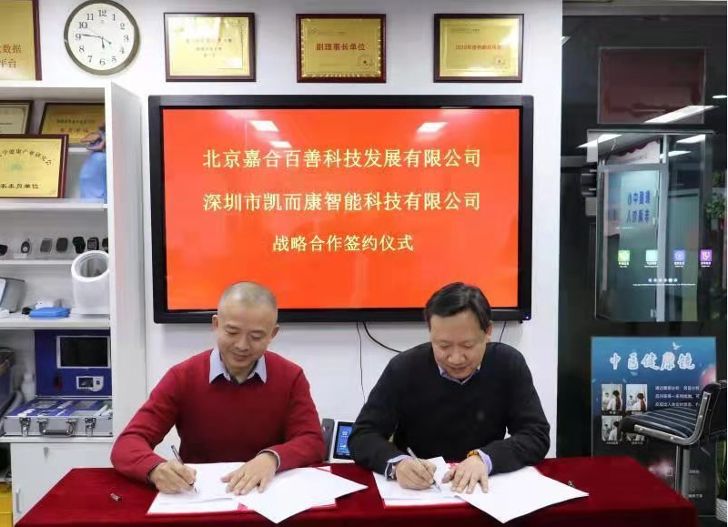 2020年1月8日,在北京嘉合百善總部,北京嘉合百善董事長(zhǎng)遲勝與 深圳市凱而康智能科技有限公司董事長(zhǎng)白淦文 隆重舉行《北京嘉合百善科技發(fā)展有限公司與深圳市凱而康智能科技有限公司 戰(zhàn)略合作》簽約儀式,雙方將攜手建立緊密合作伙伴關(guān)系.